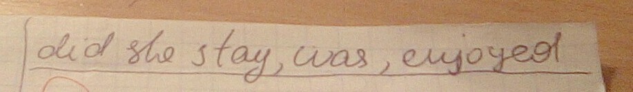 1. Visited. 2. Had. 3. Went. 4. Did you stay. 5. Did she stay. 6. Enjoyed