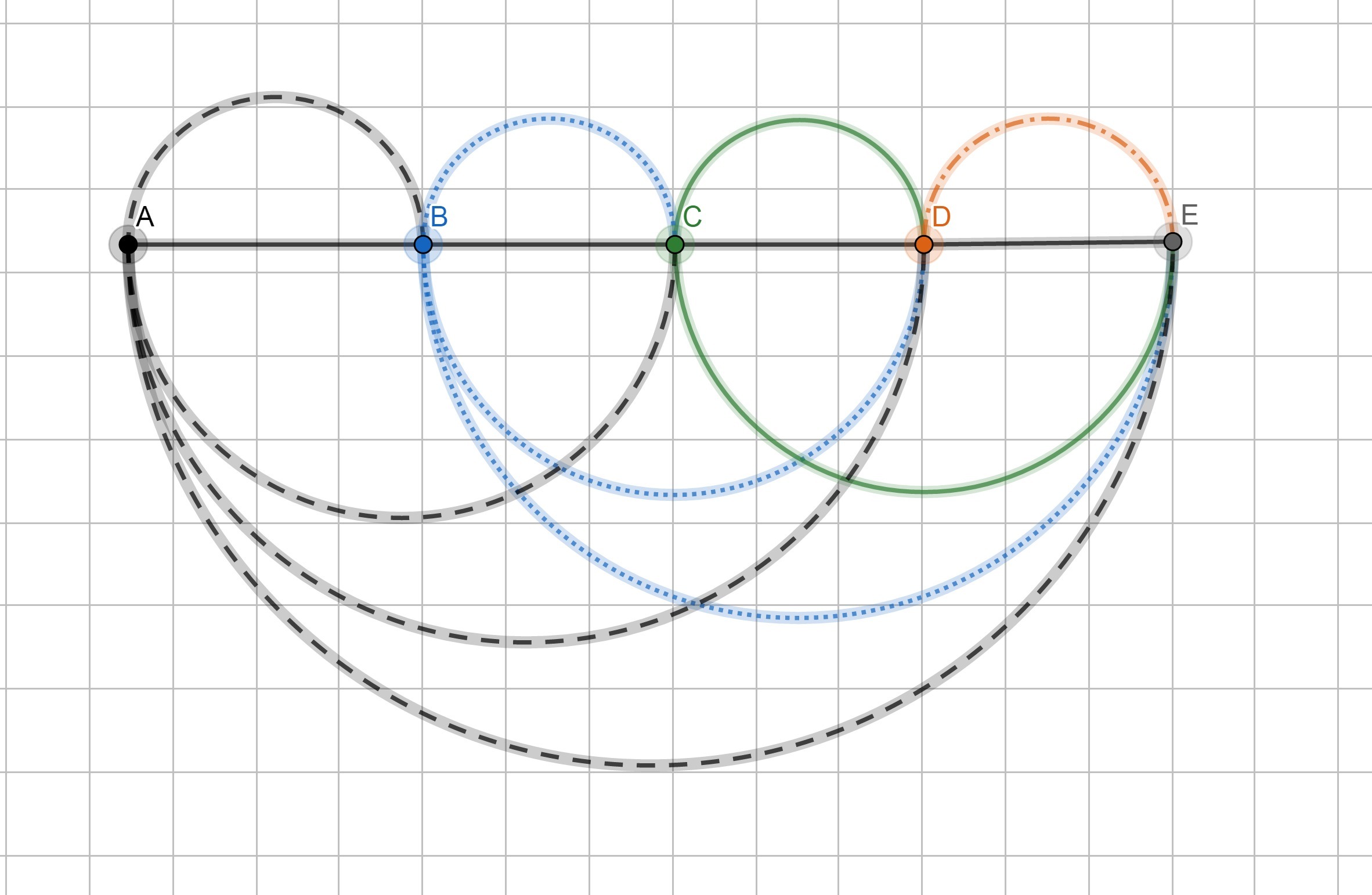 Если 4 точки, то 6 (3 + 2 + 1) отрезков, для 5 точек - 10 отрезков (4 + 3 + 2 + 1), для 6 точек - 21 отрезок (6 + 5 + 4 + 3 + 2 + 1).