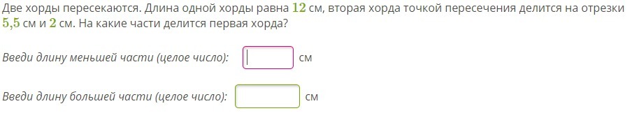Две хорды пересекаются. Длина одной хорды равна 12 см, вторая хорда точкой пересечения делится на отрезки 5,5 см и 2 см. На какие части делится первая хорда?