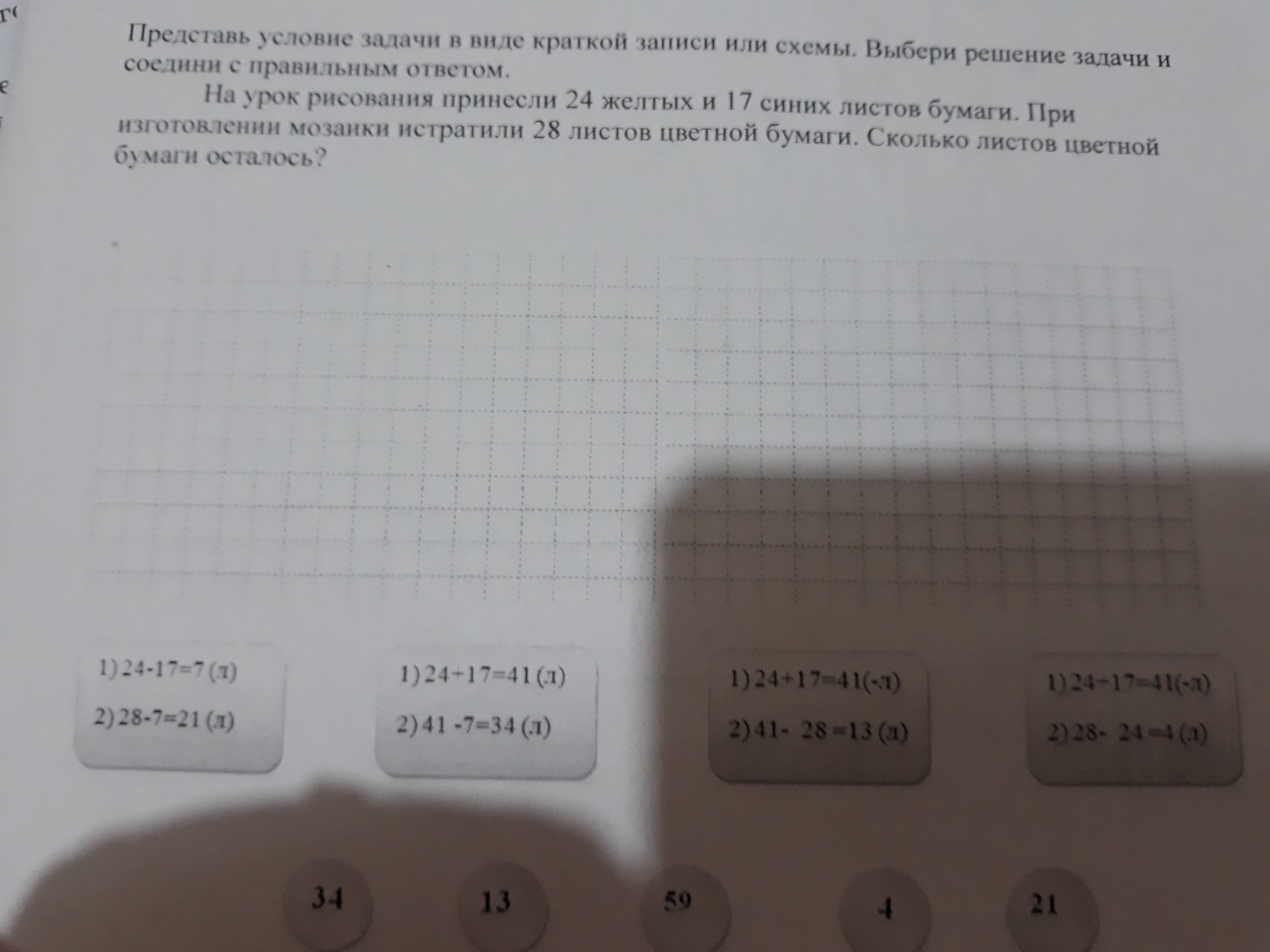 Представь условие задачи в виде краткой записи или схема Выбери решение задачи и соедини с правильным ответом на урок рисования принести 24 желтых и 17 синих листов бумаги изготовление мозаики истратили 28 листов цветной бумаги сколько листов цветной бумаги осталось