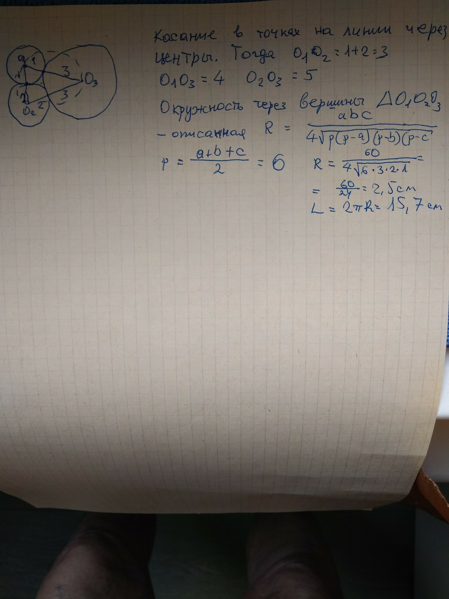 Три окружности с радиусами 1 см, 2 см и 3 см попарно касаются друг друга. Найдите длину окружности, проходящей через центры данных окружностей. Сделайте пожалуйста с рисунком и понятно