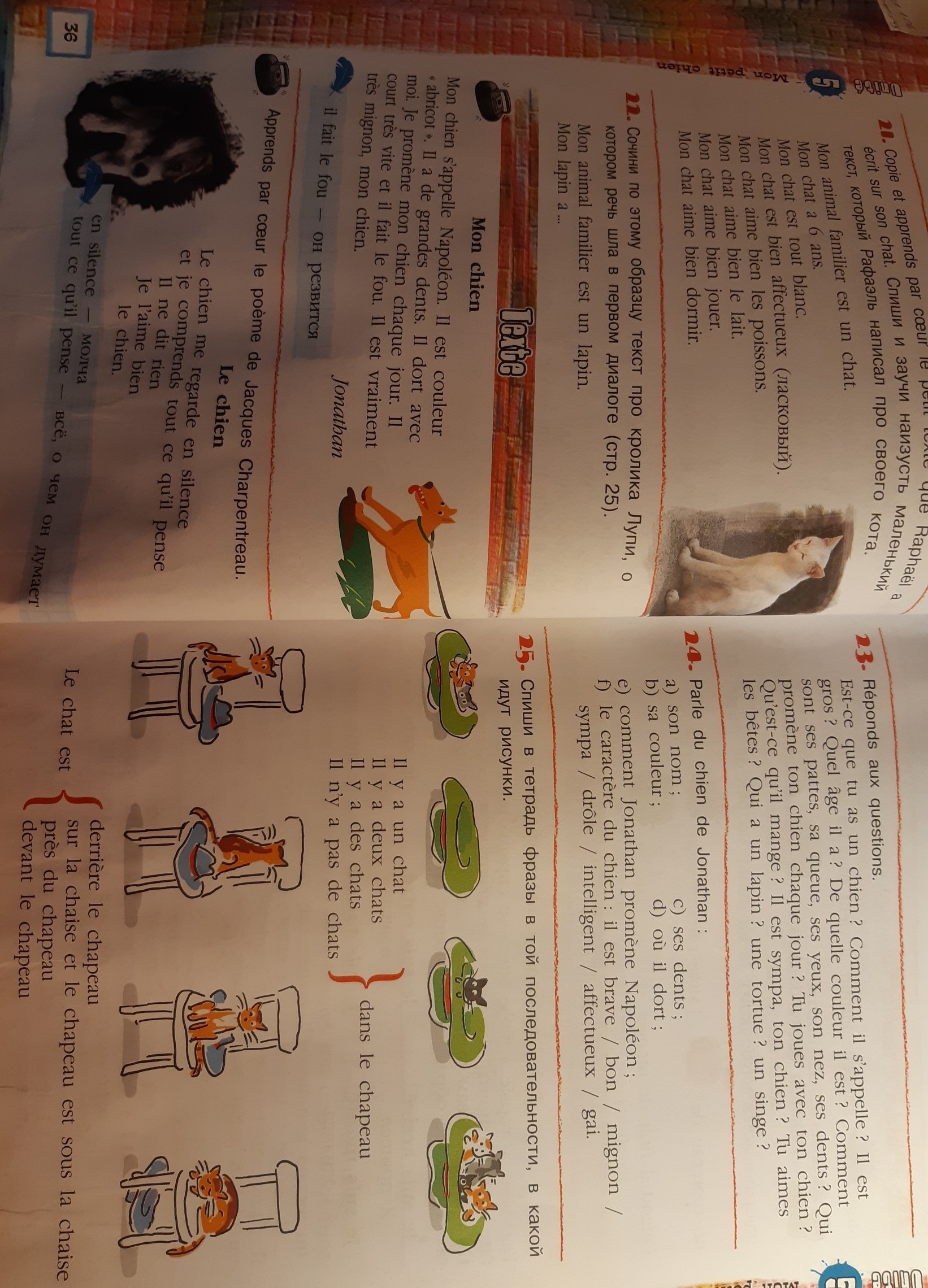 №23- oui j'ai un chien,il s'appele victor, non il n'est pas gros, il a trois ans, il est blanc, ses pattes sont noir ,son queue est groun, ses yeux sont vert, son nez est noir et ses dents sont blanc, dabitude je lui promene, oui je joue avec il, il mange la viande, bien sur il est sympa, oui j'adore les bétes, mon ami a le lapin