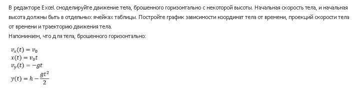 Я не очень разбираюсь в физике и не уверен, что до конца понял задание, но реализовал все формулы, которые у вас написаны в виде графика Excel (g = 10).