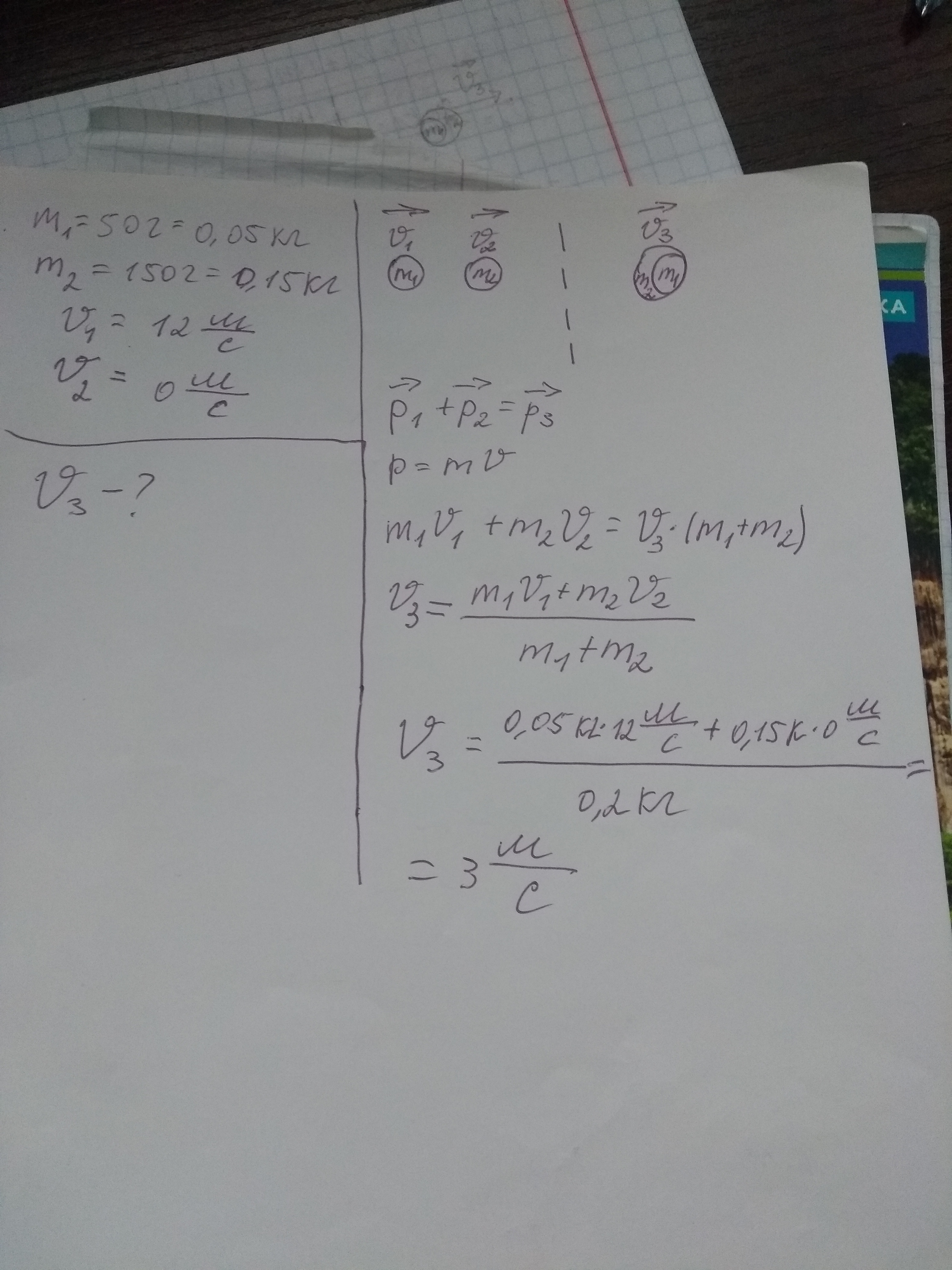 Куля масою 50 г яка рухалася зі швидкістю 12 м/с, влучає в нерухому кулю 150 г і застряє в ній.З якою швидкістю рухатиметься система після зіткненя?