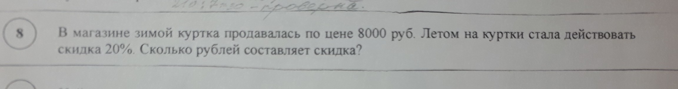 в магазине зимой куртка продавали по цене 8000 руб. летом на куртку и стала действовать скидка 20% сколько рублей составляет скидка