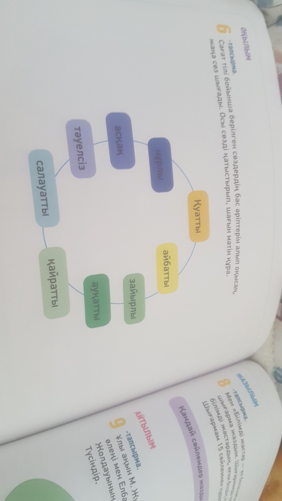 В задании с первых букв по часовой стрелке прочитать буквы и выйдет слово --ҚАЗАҚСТАН.и из этого слова составить текст.
