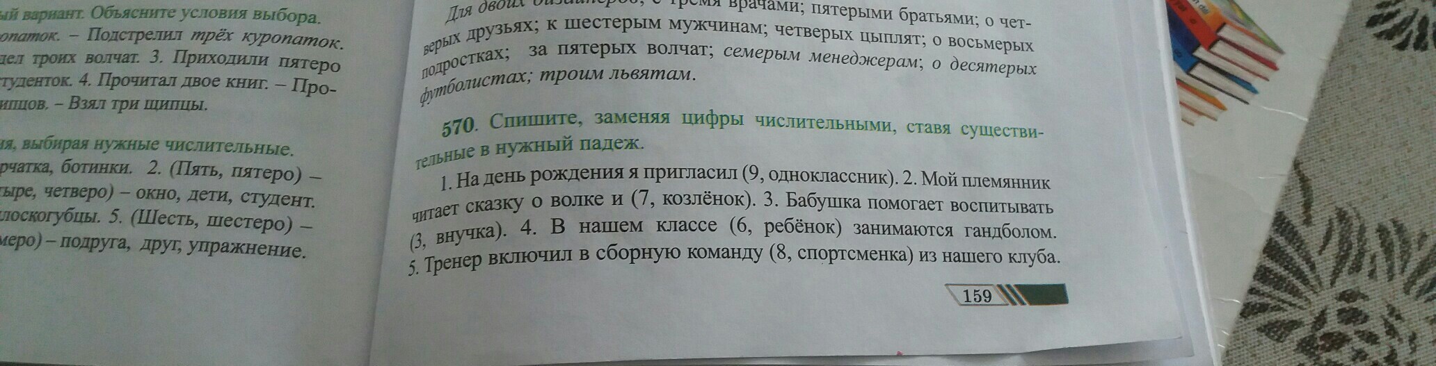 На день рождения я пригласил девять одноклассников. Мой племянник читает сказку о волке и семи козлёнках. Бабушка помогает воспитывать три внучки. В нашем классе шесть детей занимаются гандболом. Тренер включил в сборную команду восемь спортсменов из нашего клуба.