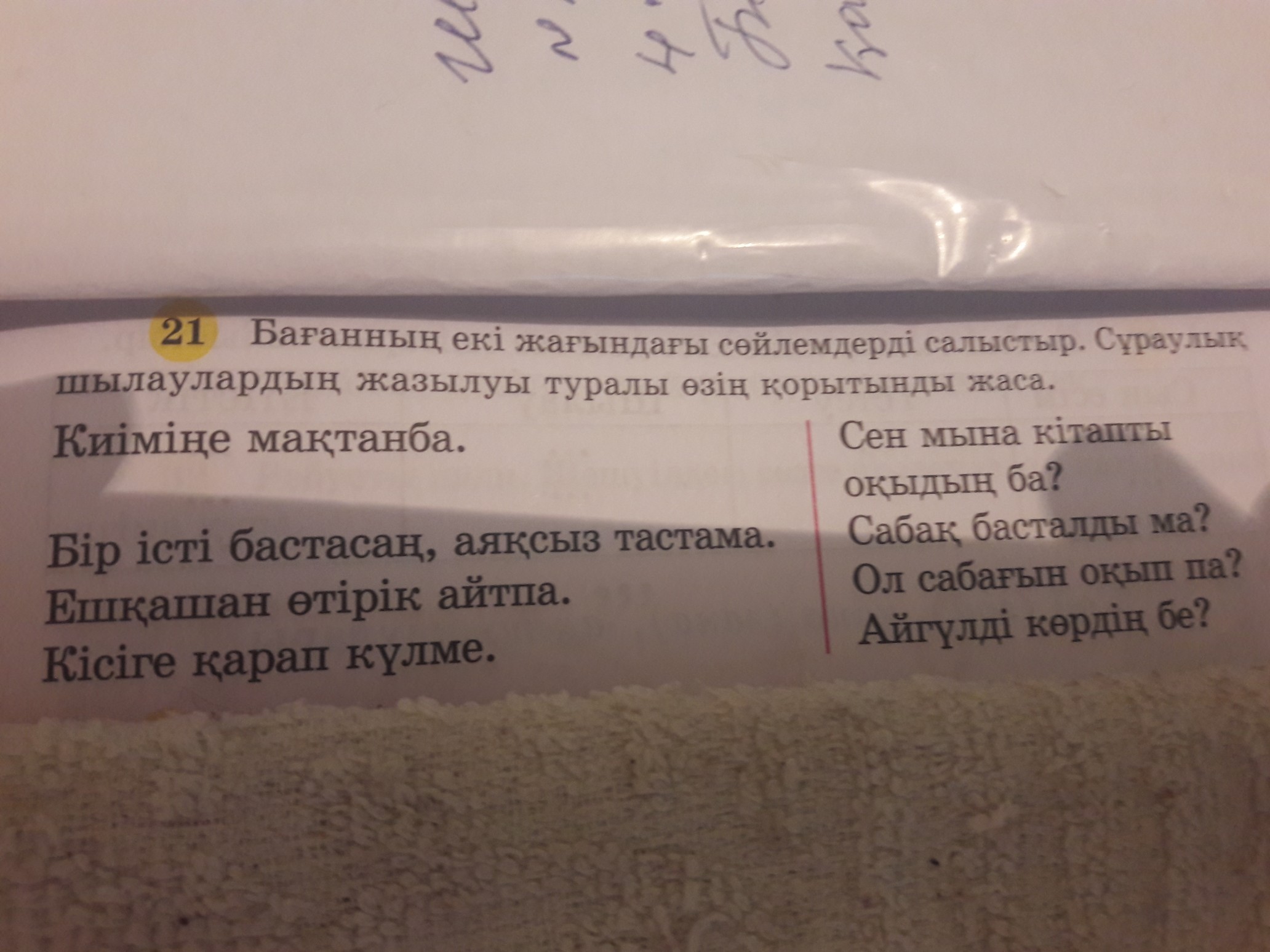Бірінші бағанда бұйрық,ақыл беріп тұр.Ал екінші бағанда сұрақ қойып отыр.