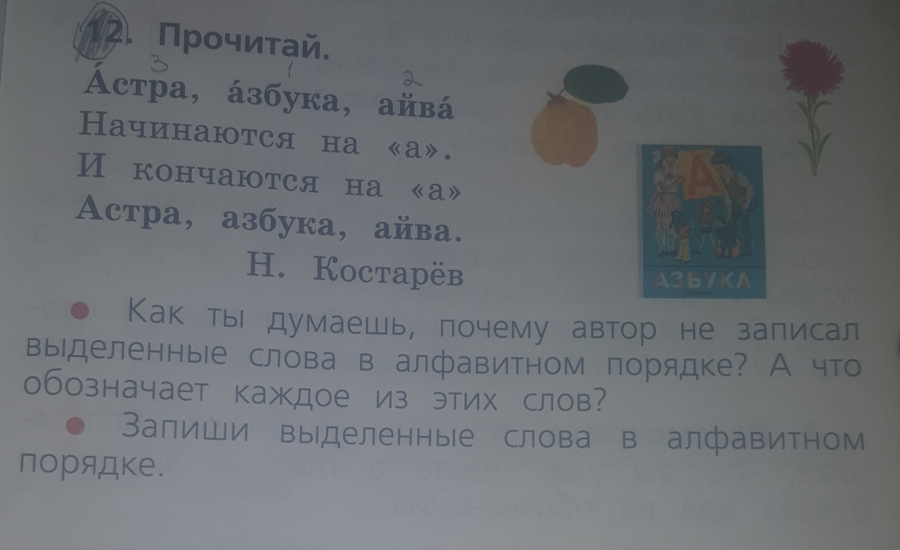 Прочитай.Астра,азбука,айва.Начинаются на "а".И кончаются на "а".Астра,азбука,айва.Запиши выделенные слова в алфавитном порядке.