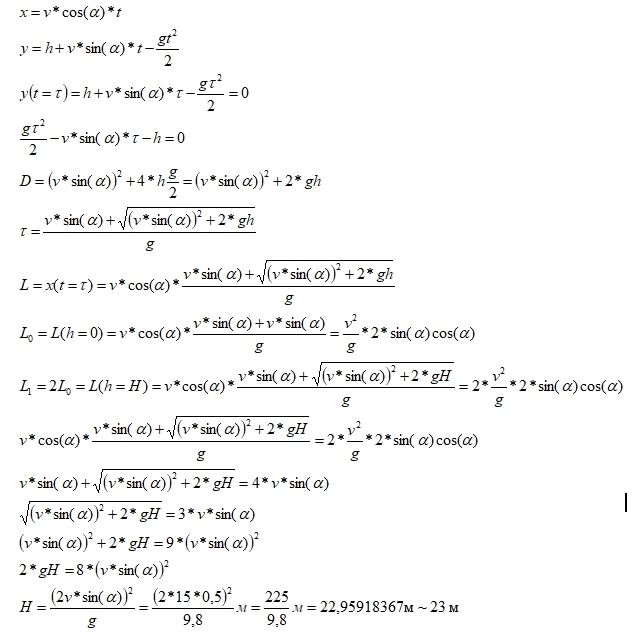 Тело бросают с поверхности земли под углом 30° к горизонту с начальной скоростью 15 м/с. На какую высоту необходимо поднять точку бросания, чтобы дальность полета увеличилась в 2 раза (угол и начальная скорость неизменны)? Ответ округлите до целых. Ускорение свободного падения считать равным 9,8 м/с2. Сопротивление воздуха не учитывать. решение