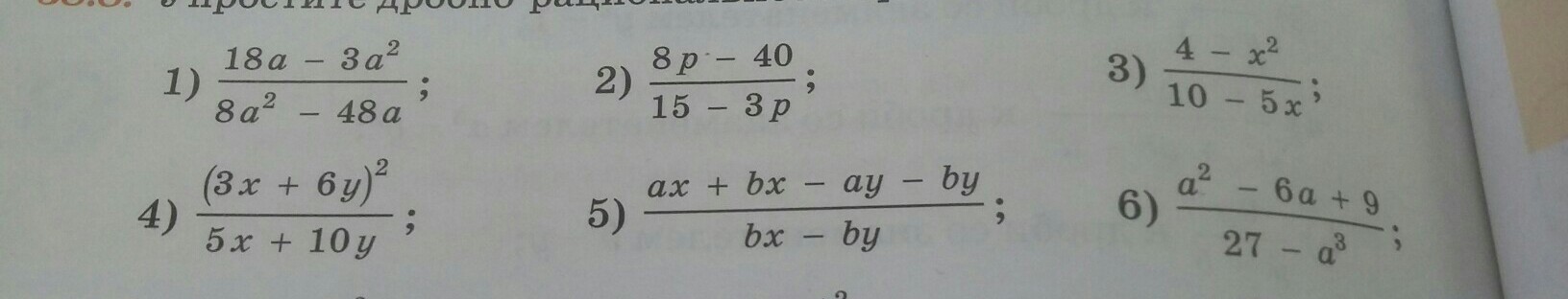6)  frac{a^2-6a+9}{27-a^3} =  frac{a^2- 2*a*3 + 3^2}{-(a^3-3^3)} =  frac{(a-3)^2}{-(a-3)(a^2+3a+3^2)} =  \  \