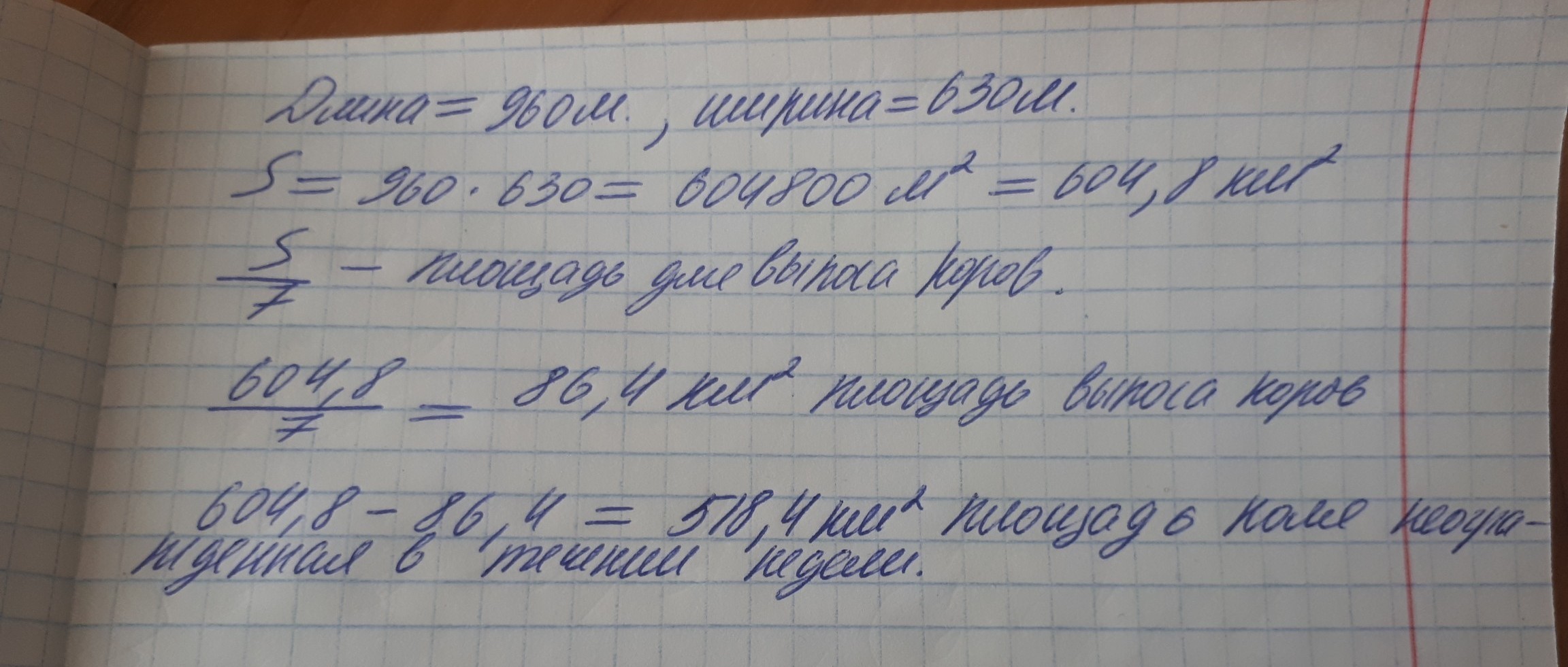 В колхозе под пасбище отведён участок поля прямоугольной формы, длина которого 960м, а ширина 630м. Седьмую часть площади этого участка оградили для выпоса коров в течении недели. Какая площадь поля осталась неогрождёной? Можно просто в строчку, а можно и столбиком, ещё круче вырожением!