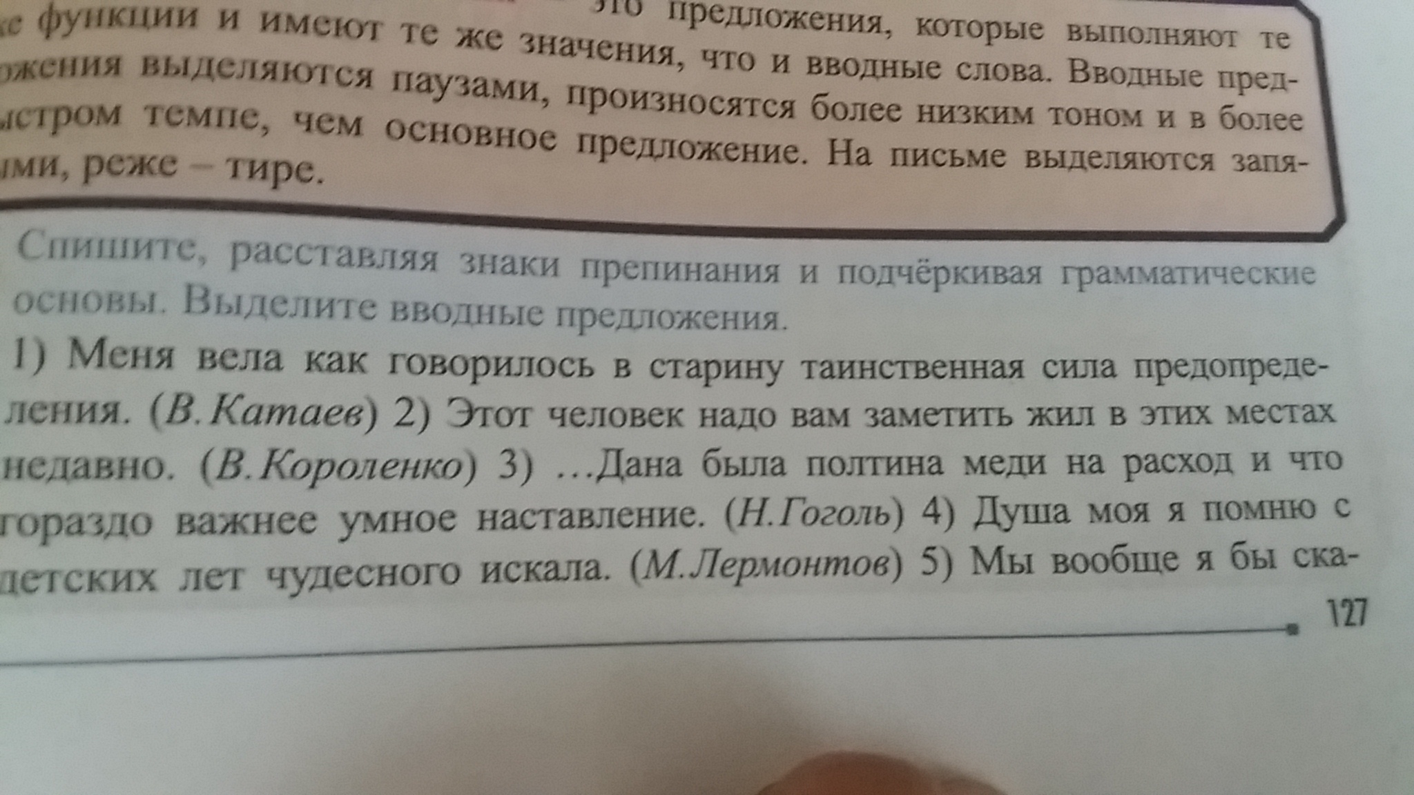 1) Меня вела, как говорилось, в старину таинственная сила предопределения. 2) Этот человек, надо вам заметить, жил в этих местах недавно. 3) ...Дана была полтина меди на расход, и что гораздо важнее - умное наставление. 4) Душа моя, я помню с детских лет, чудесного искала. 5) Мы вообще, я бы сказал, немного равнодушны ко всему, что окружает нас на земле. 6) Он меня, вы знаете, очень уважает. 7) В это время, казалось ему, мелькнул перед ним какой-то странный образ человеческого лица. 8) Как принято говорить, в газетных отчетах, "его стены видели" многих знаменитых людей.