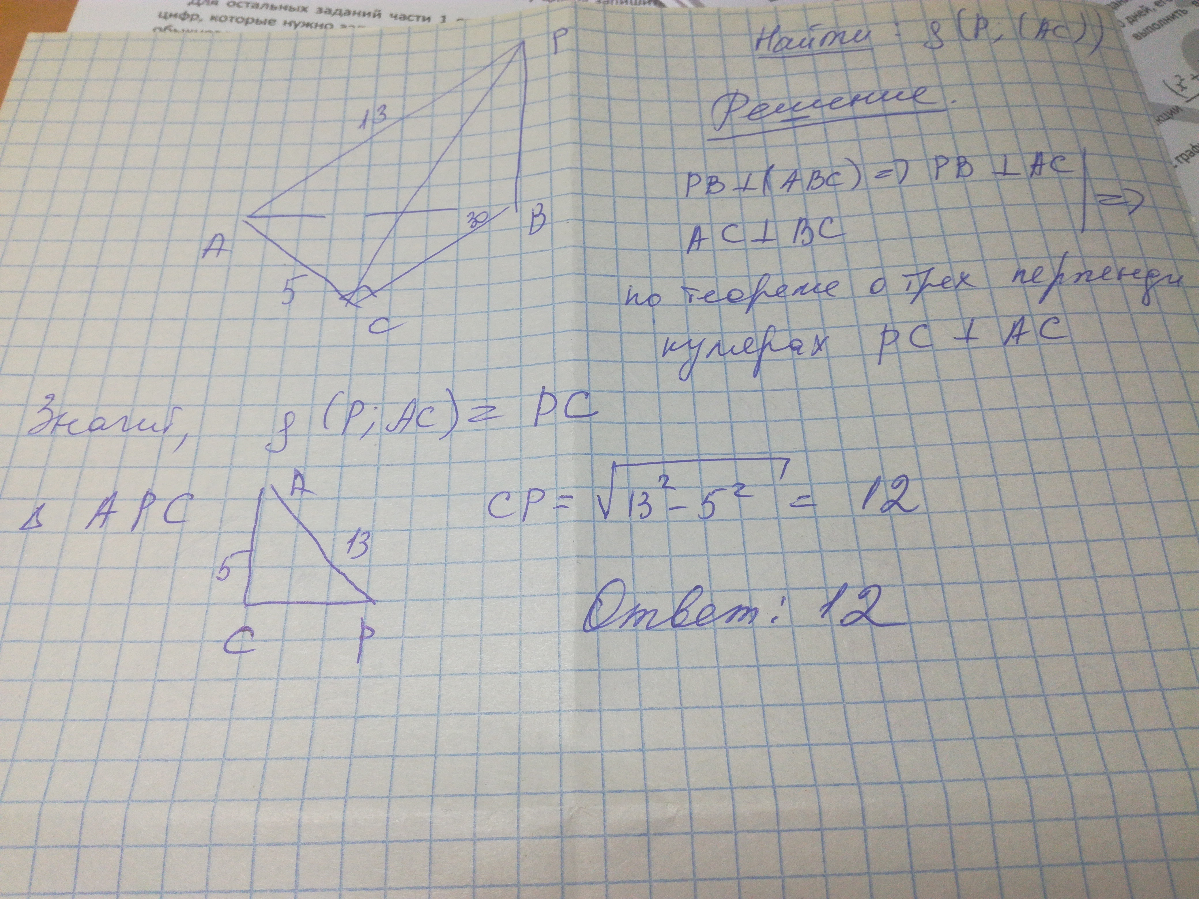 К плоскости прямоугольного треугольника авс,где угол с=90 градусов проведен перпендикуляр рв,ра=13 см,угол авс=30 градусов ;ас=5 см.вычислите расстояние от точки р до прямой ас.ПОМОГИТЕ ПОЖАЛУЙСТА