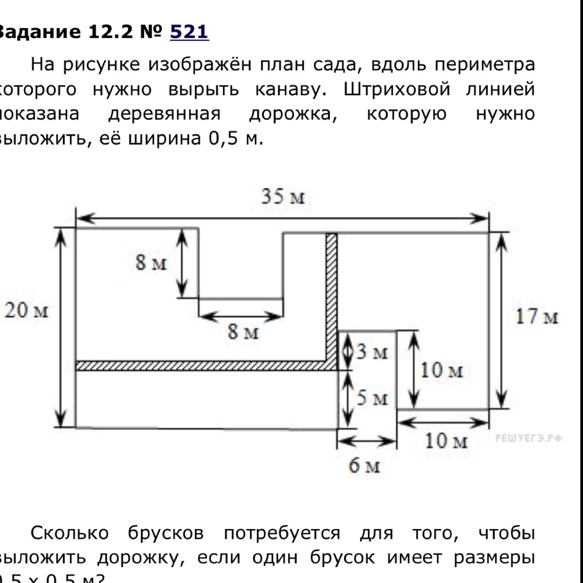 На рисунке изображён план сада, вдоль периметра которого нужно вырыть канаву. Штриховой линией показана деревянная дорожка, которую нужно выложить, её ширина 0,5 м. Сколько брусков потребуется для того, чтобы выложить дорожку, если один брусок имеет размеры 0,5 x 0,5 м?
