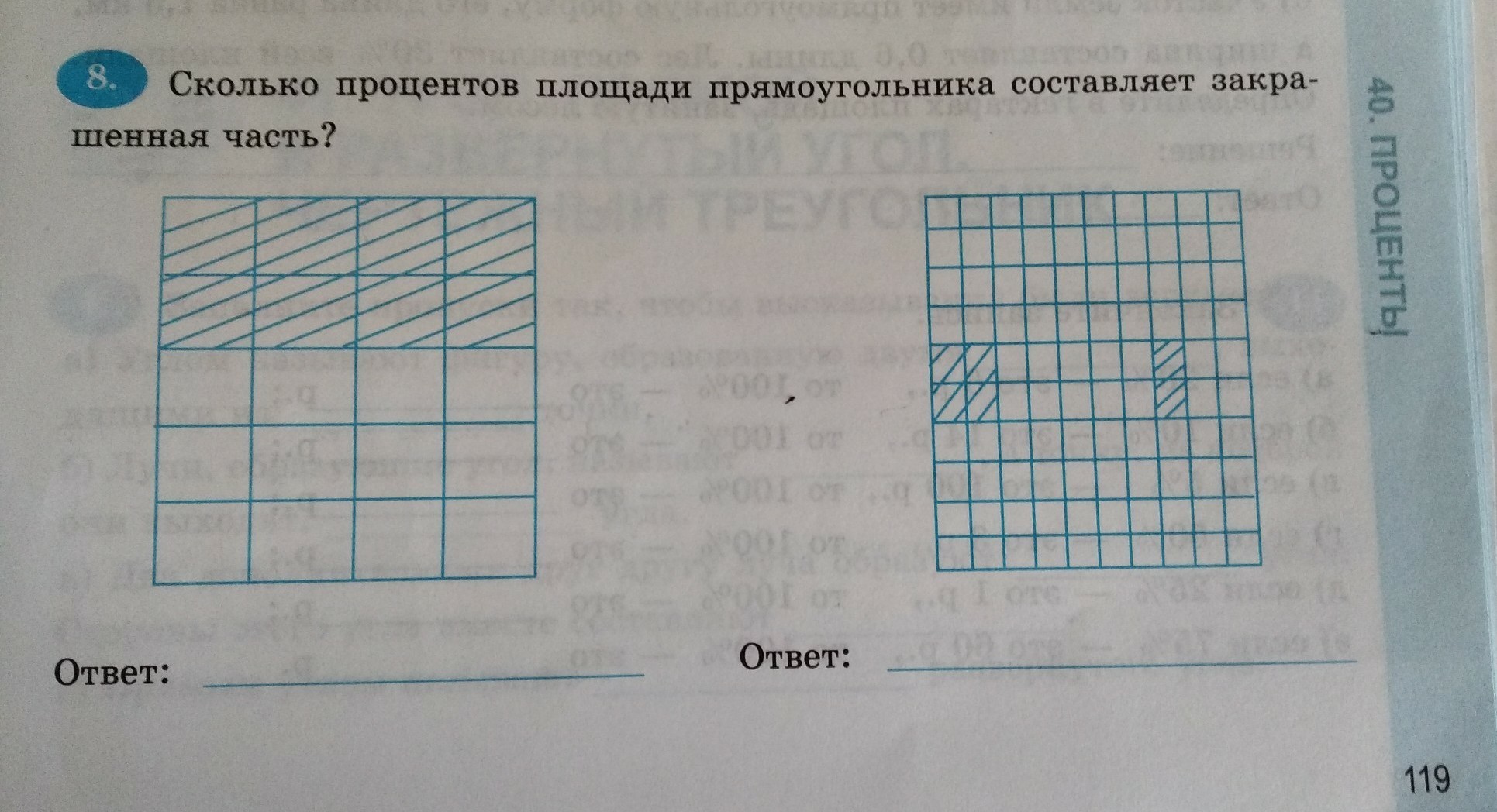 нужно сосчитать все закрашенные квадраты и умножить на 100 % и в ответе приписать проценты 1) 8 % 2) 2%
