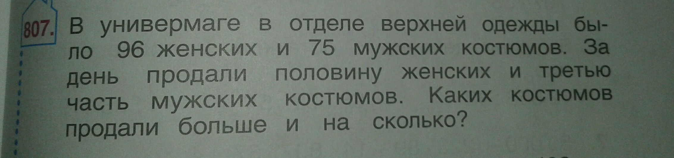 в универмаге в отделе верхней одежды было 96 женских и 75 мужских костюмов на день продали половину женских и третью часть мужских костюмов каких костюмов продали больше и на сколько