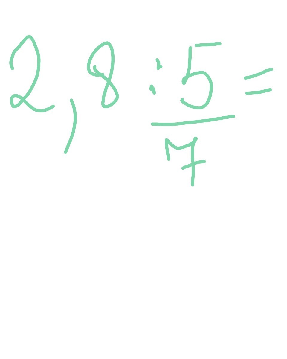 Смотри, сначала мы 2.8 преобразовываем в дробь, потом при делении мы вторую дробь 5/7 переворачиваем и получаем 7/5. Числители и знаменатели перемножаются, во время этого можно сократить... Или потом сократить дробь, как это сделала я. Так же сейчас можно домножить и получить десятичную дробь.