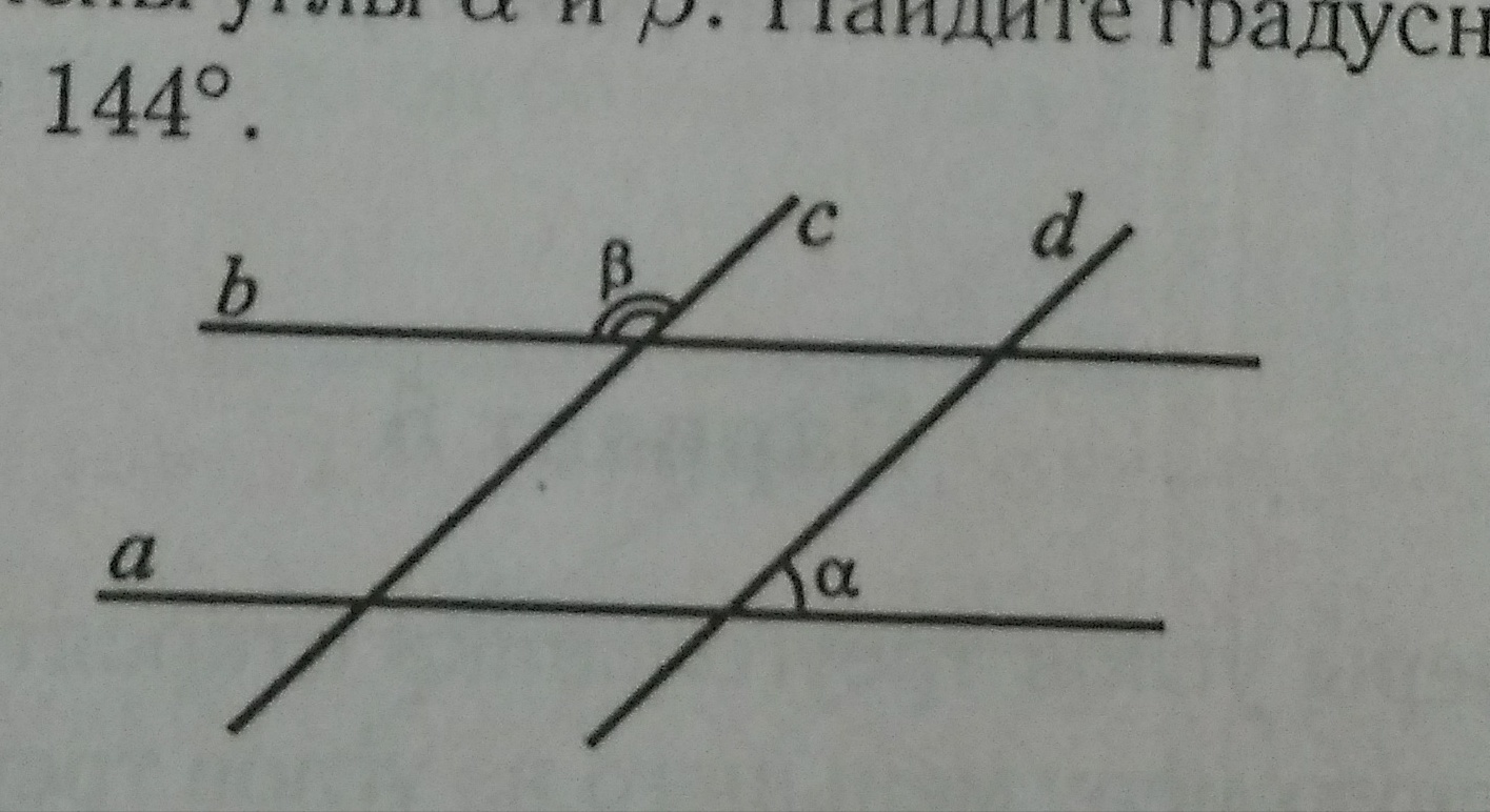 На рисунке изображены две пары параллельных прямых: a, b и c, d, а также отмечены углы α и β. Найдите градусную меру угла α, если угол β равен 144°.
