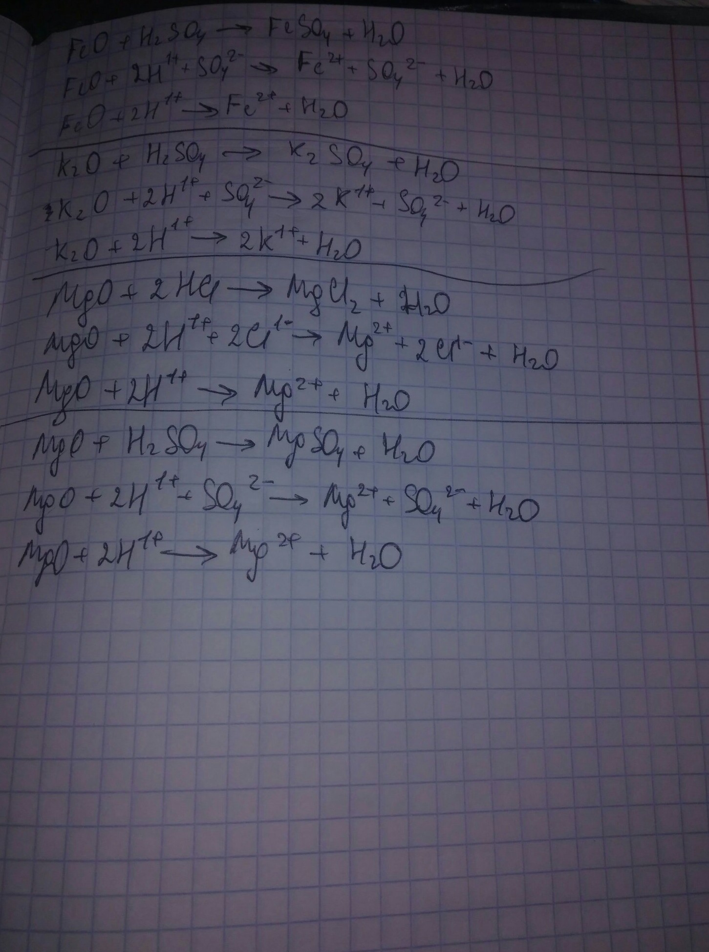 напиши реакции в молекулярном и ионном видах взаимодействия основных оксидов CuO,BaO,FeO,K2O,MgO с соляной и серной кислотой.