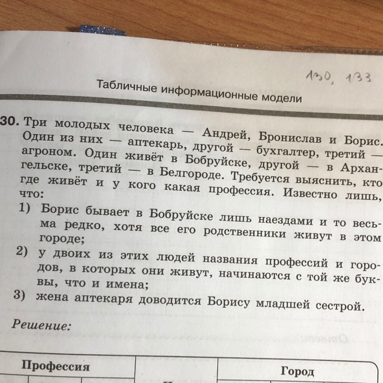 2. названия городов имена и професси у двух начинаются с одной буквы. Аптекарь не получится, он живет в Бобруйске, остаются Антоном и бухгалтер = Агроном Андрей Архангельск и Бухгалтер Белгород Борис.