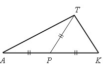 1) Треугольник АТК -прямоугольный, т.к. медиана ТР равна половине стороны АК, что верно только для прямоугольных треугольников (медиана равна половине гипотенузы).