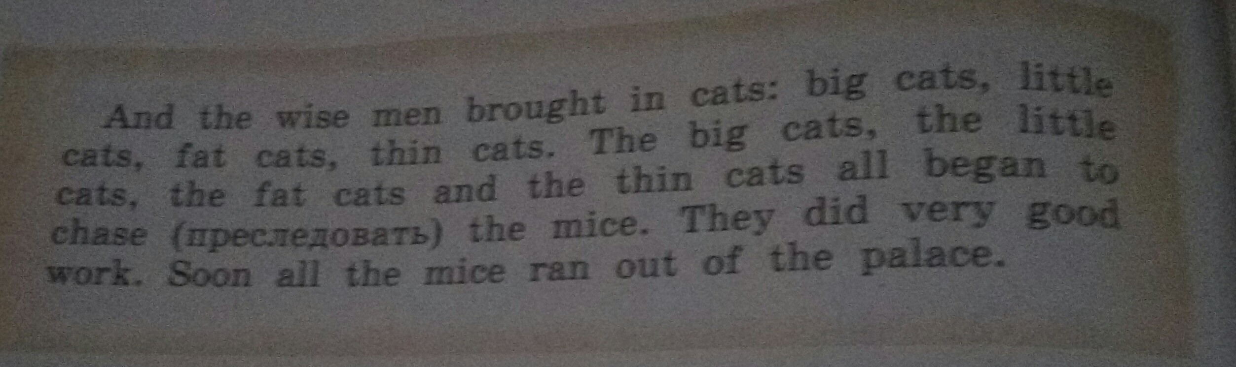 И мудрецы привезли кошек: больших кошек, маленьких кошек, толстых кошек, тонких кошек. Большие кошки, маленькие коты, толстые кошки и тонкие кошки начали преследовать мышей. Они сделали очень хорошую работу. Вскоре все мыши выбежал из дворца.