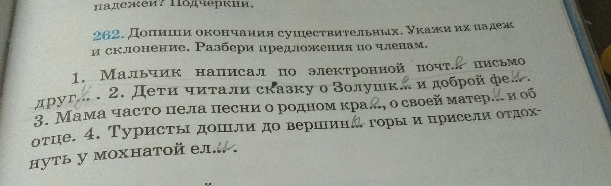 Почте- дательный падеж, 1 скл.; другу- дательный падеж, 2 скл.; Золушке-дательный п., 1 скл; фее- дательный падеж, 1 скл; крае- предложный п., 2 скл; матери-предложный падеж, 3 скл; вершины- родительный падеж, 1 скл 4 ели- родительный падеж, 3 скл