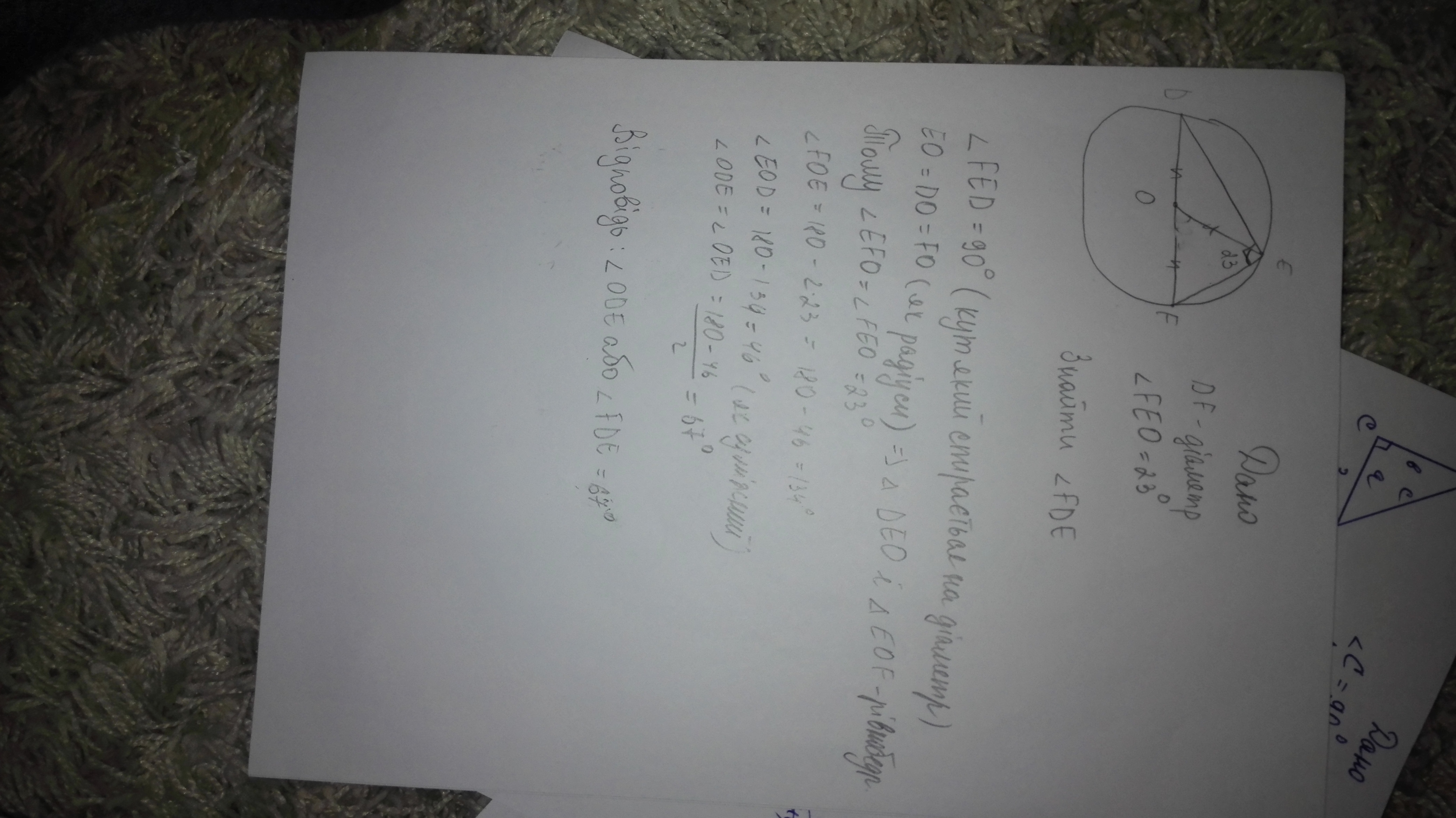 у кооі з центром О проведено діаметр DF і хорда FE .Знайдіть кут FDE якщо кут FEO =23° ) онтрольн