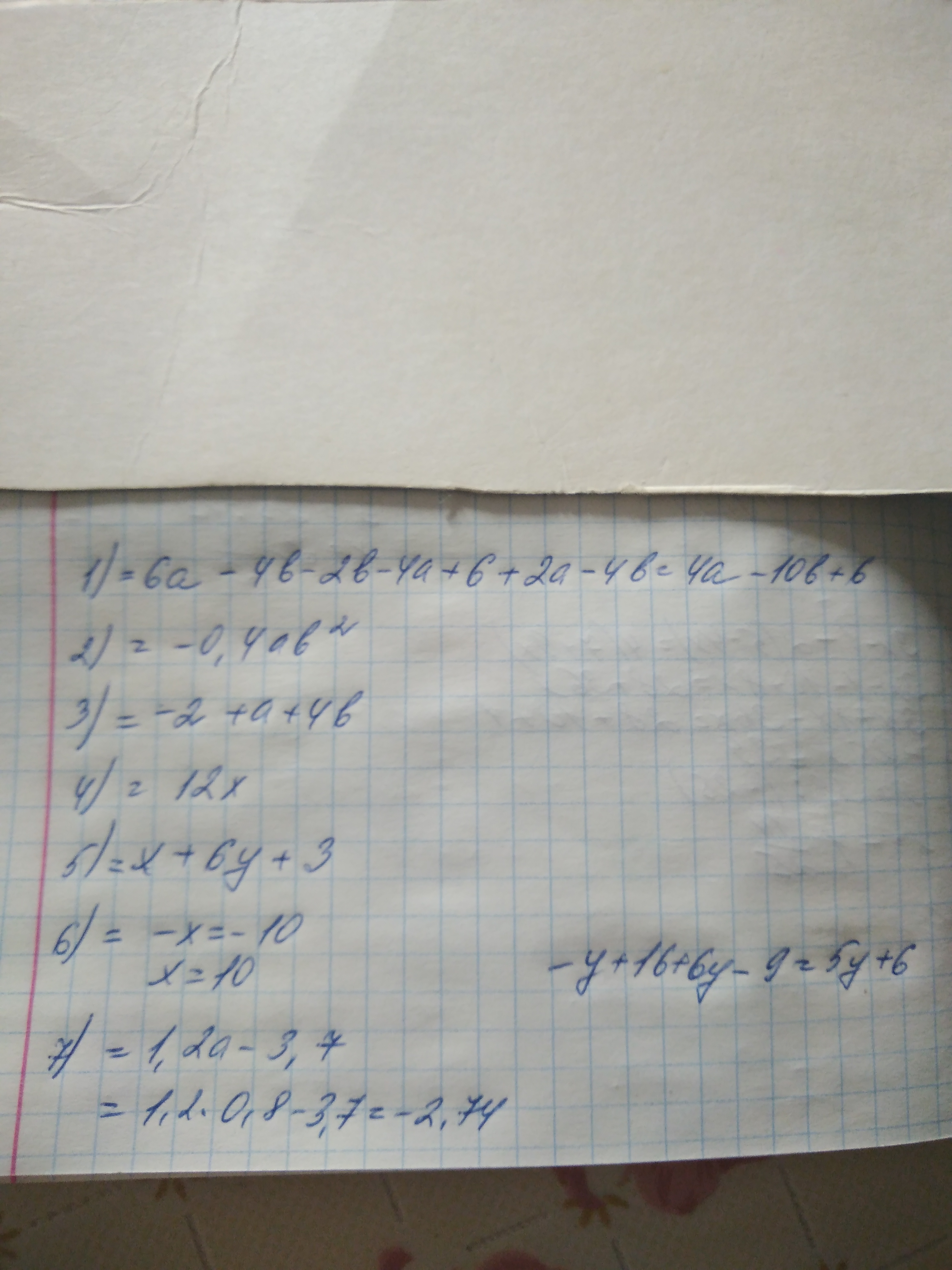 Помогите пожалуйста тест написать. 1)Приведите подобные слагаемые: 2(3a - 2b) - 2(b + 2a - 3) + 4(0,5a - b). 2)Упростите выражение: 2,3ab2 + 1,3ab2 + 2ab2 - 5ab2 - ab2. 3) Приведите подобные слагаемые: 5 - 2a + 4b - 7 + 3a 4)Приведите подобные слагаемые: 5х + 3х - 3х + 7х. И найдите значение выражения при х = 3. 5)Приведите подобные слагаемые: -3x + 2y + 5x +10 - x + 4y - 7. 6)Решите уравнение: 2х + 3х - 6х = -10 7)Упростите выражение -3a - 5a + 9,2a - 3,7. И найдите его значение при a = 0. 8) Раскройте скобки и приведите подобные слагаемые: