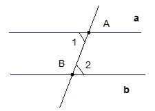 Итак, даны две прямые а и b. Прямая АВ рассекает эти прямые и <1=<2.