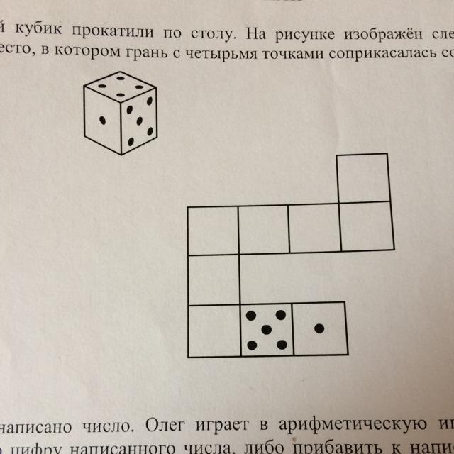 Игральный кубик прокатили по столу .на рисунке изображен след кубика. отметьте на рисунке место в котором грань четырьмя точкам соприкасался столом