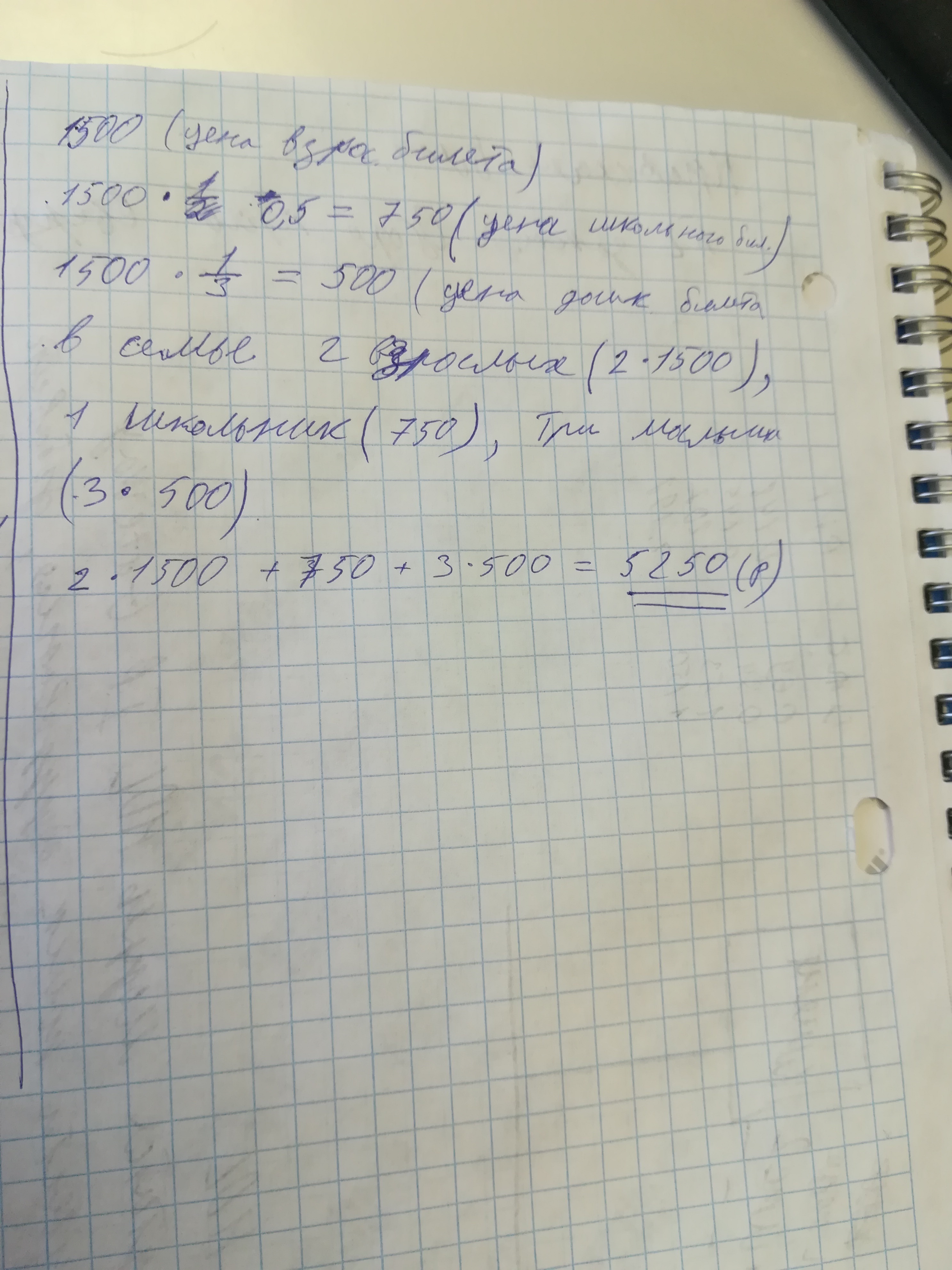 Билет на цирковое представление «Маугли» стоит для взрослого 1500 руб., для школьника — половину стоимости взрослого билета, а для дошкольника треть стоимости взрослого билета. Сколько рублей должна заплатить за билеты семья, включающая двух родителей, одного школьника и трех малышей? Запишите решение и ответ.