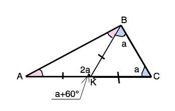 В треугольникн abc на стороне ac взята точка k, ak=kc=bk, угол akb на 60° больше угла c. Найдите угол abk. Только напишите доказательство
