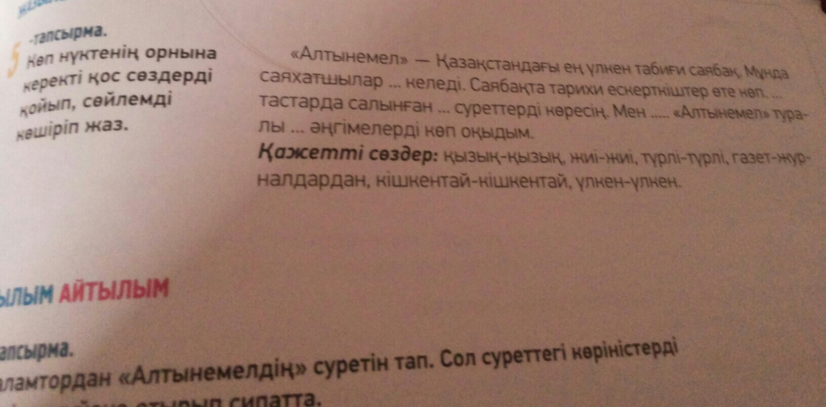 "Алтынемел"-Қазақстандағы ең үлкен саябақ. Мұнда саяхатшылар жиі-жиі келеді. Саябақта тарихи ескеткіштер өте көп. Үлкен-үлкен тастарда салынған түрлі-түсті суреттерді көресің. Мен газет -журналдардан "Алтынемел" туралы қызық-қызық әңгімелерді көп оқыдым.