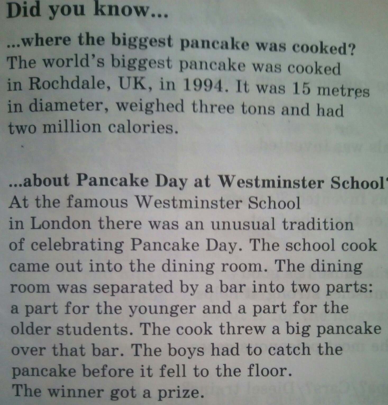 В знаменитой Вестминстерской школе в Лондоне была необычная традиция празднования день Блинчика. Школьный повар выходил в столовую. Столовая была разделена баром на две части: часть для младших и часть для старших учеников. Повар бросал большой блин над этим баром. Мальчикам нужно было поймать блин, прежде чем он упал на пол. Победитель получает приз.