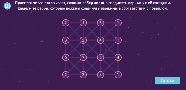 Правило: число показывает, сколько рёбер должно соединять вершину с её соседями. Выдели те рёбра, которые должны соединять вершины в соответсвии с правилом.
