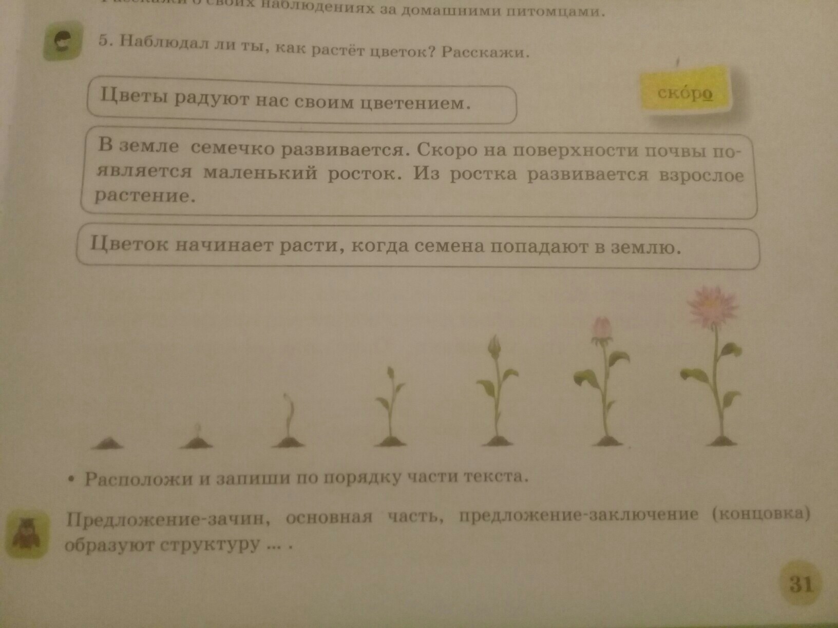 2.В земле семечко развивается . Скоро на поверхности почвы появляется маленький росток. Из ростка развивается взрослое растение.