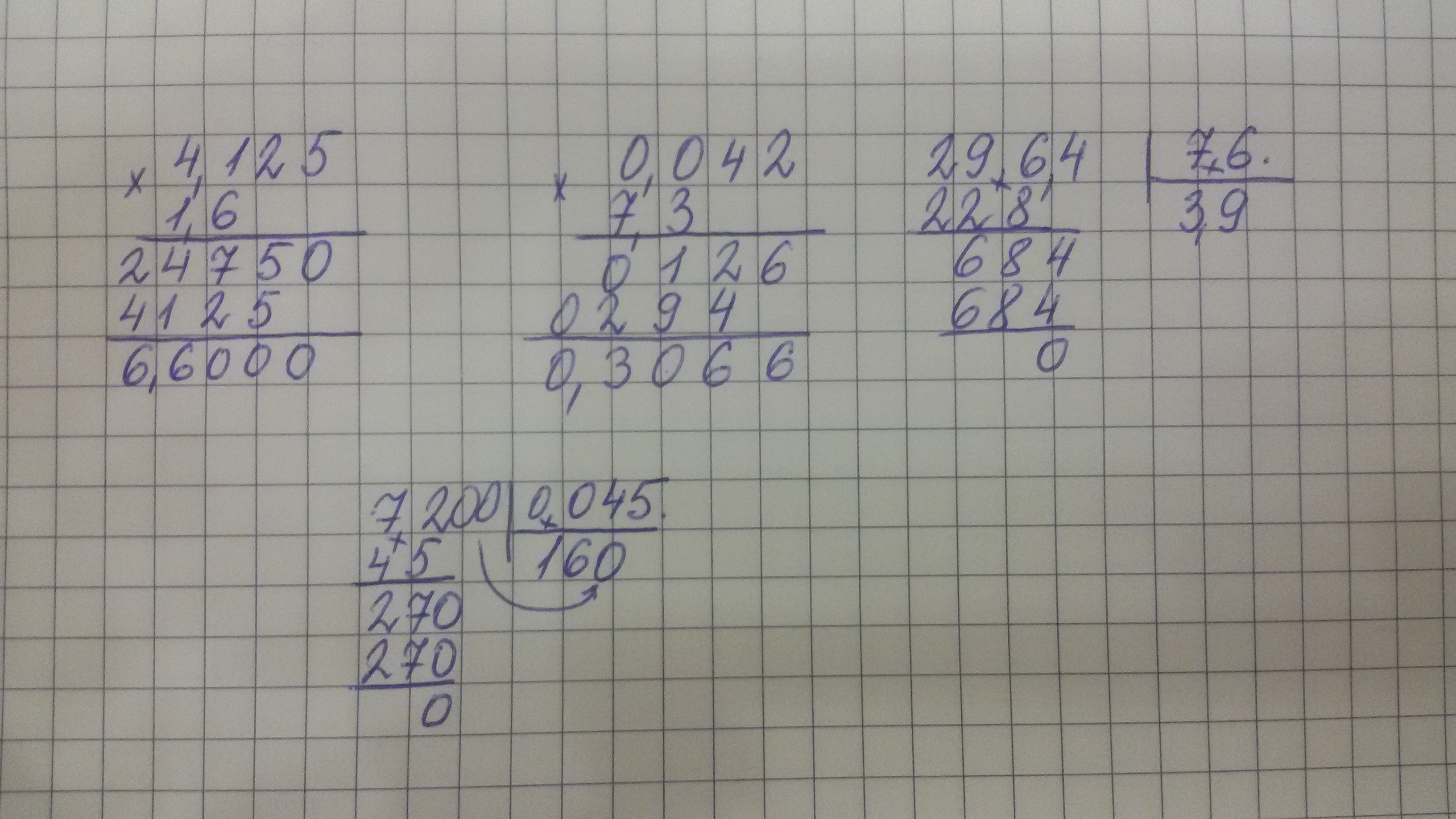 1). Выполните действие: а). 4,125 ∙ 1,6; б). 0,042 ∙ 7,3; в). 29,64 : 7,6; г). 7,2 : 0,045. 2). Найдите значение выражения ( 18 – 16,9 ) ∙ 3,3 – 3 : 7,5 3). С кондитерской фабрики отгрузили 20 коробок мармелада по 1,3 кг в коробке и 30 коробок по 1,1 кг мармелада. Сколько весит весь отправленный мармелад? 4). Поезд 3 ч шел со скоростью 63,2 км/ч и 4 ч со скоростью 76,5 км/ч. Найдите весь пройденный путь.