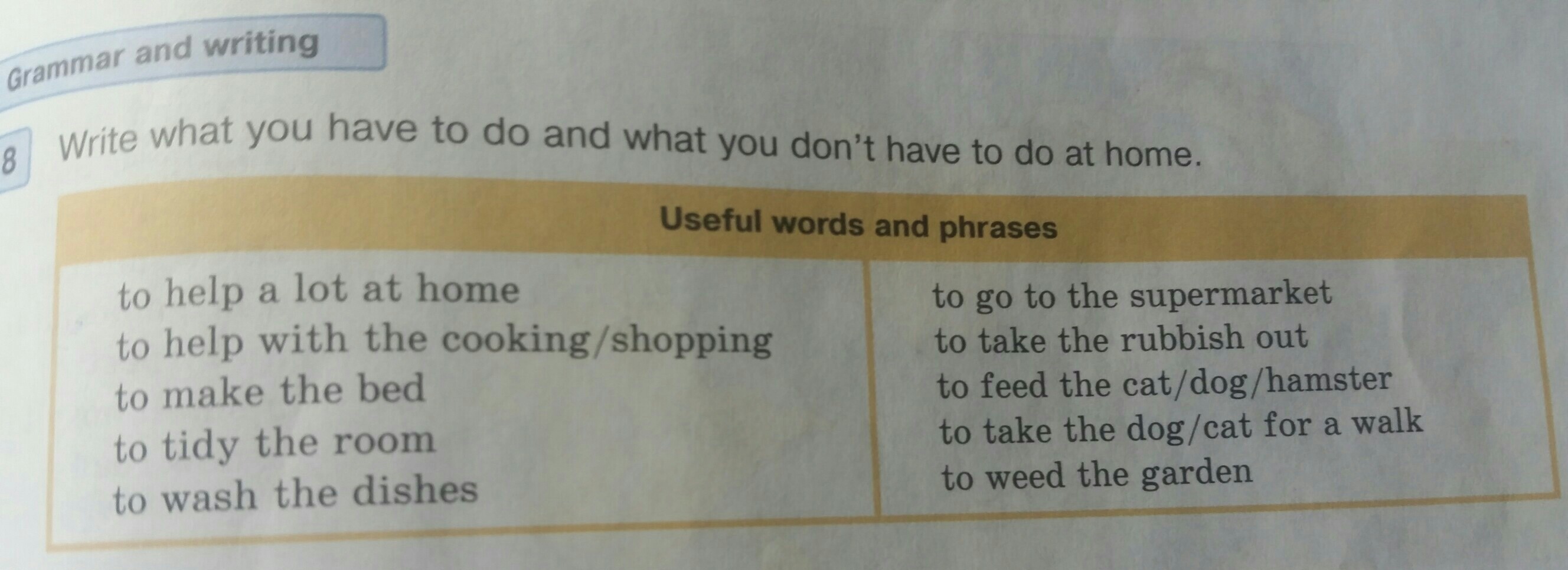 помогать много делать по дому, Помогать с приготовлением пищи и покупками, Заправлять кровать, Прибираться в комнате, Мыть посуду. Второй столбец: ходить в супермаркет, выносить мусор, кормить кота/пса/хомяка, Выгуливать пса/кота, полоть садили огород. конструкция: I have to tidy the room - я должен прибираться в комнате. про спасибо не забудь.