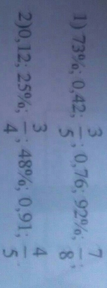 0,42 ;3/5(3:5=0,6); 73%; 76%; 7/8(7:8=0,875); 92%