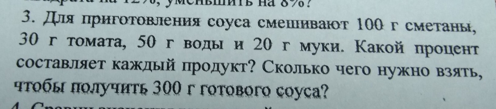 ответ: сметана - 50%, томат - 15%, вода - 25%, мука - 10%.