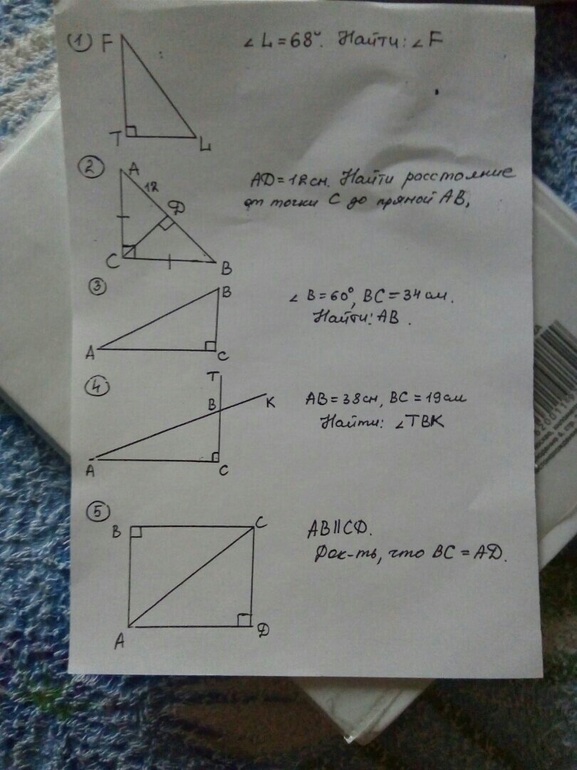 1)как известно в прямоугольном треугольнике один угол 90 градусов ,а сумма двух острых углов тоже 90 градусов по свойству прямоугольного треугольника если один угол 68 градусов а другой 90 то третий угол равен 22 градусам так как 180-(90+68)=22