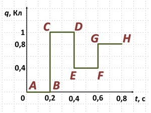 На графике приведена зависимость заряда, проходящего через поперечное сечение проводника, от времени. Используя эти данные, определи, в течение какого промежутка времени магнитное поле, возникающее вокруг проводника, было максимальным; не существовало вовсе.
