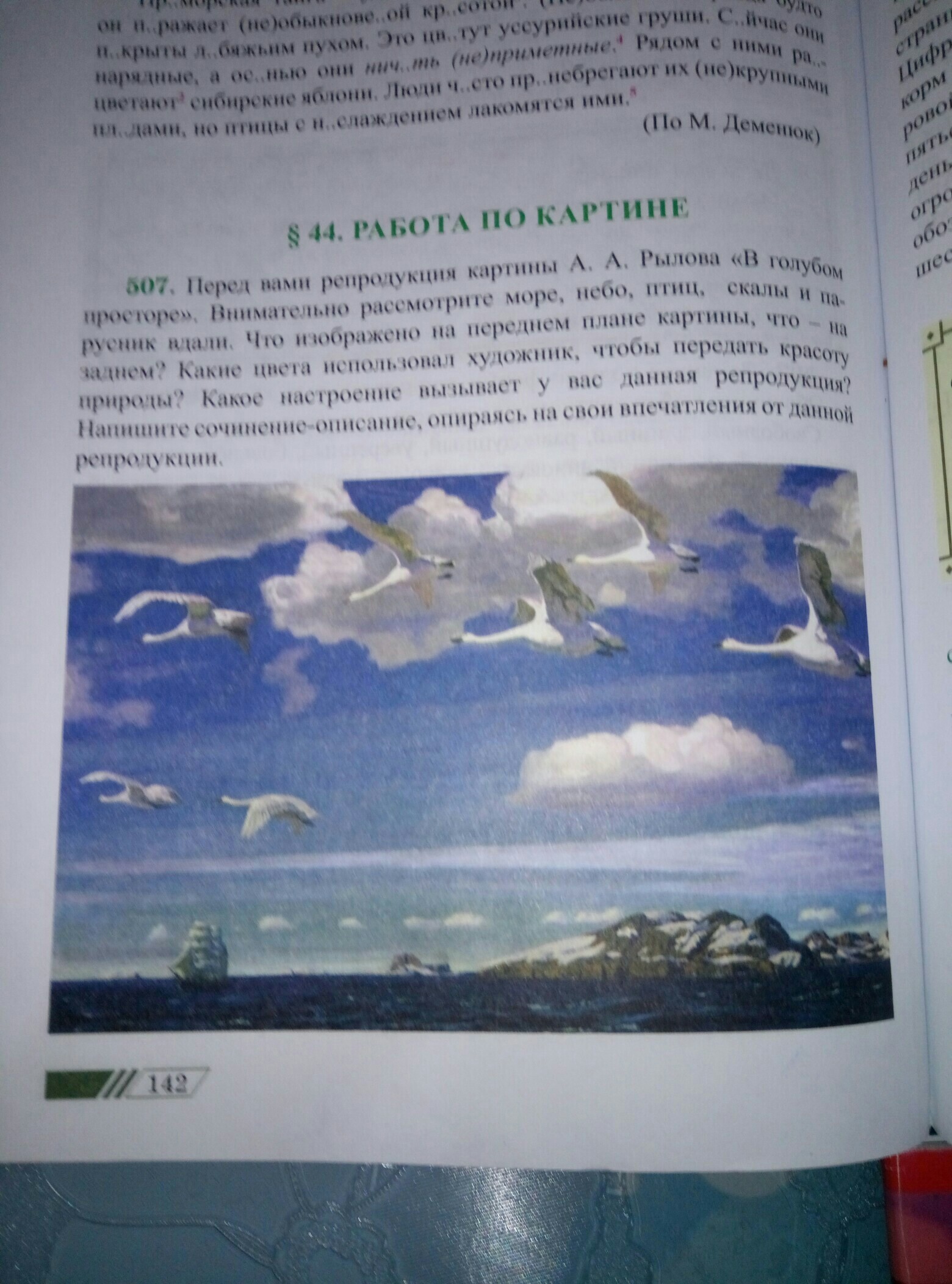на картине видно что Рылова очень тонко выразила свое вдохновение.она использовала очень нежные цвета.На переднем плане видны альбатросы каторые летят над морем.В заднем плане ведна большая яхта и величественные скалы.Небо облачое вечно голубое.Она нарисовала то что люди не замечают такой восхительной красотой природы.Она рисовала с жизнью или как говориться написала этот красивый пейзаж.Мое почтение А.А.Рылове