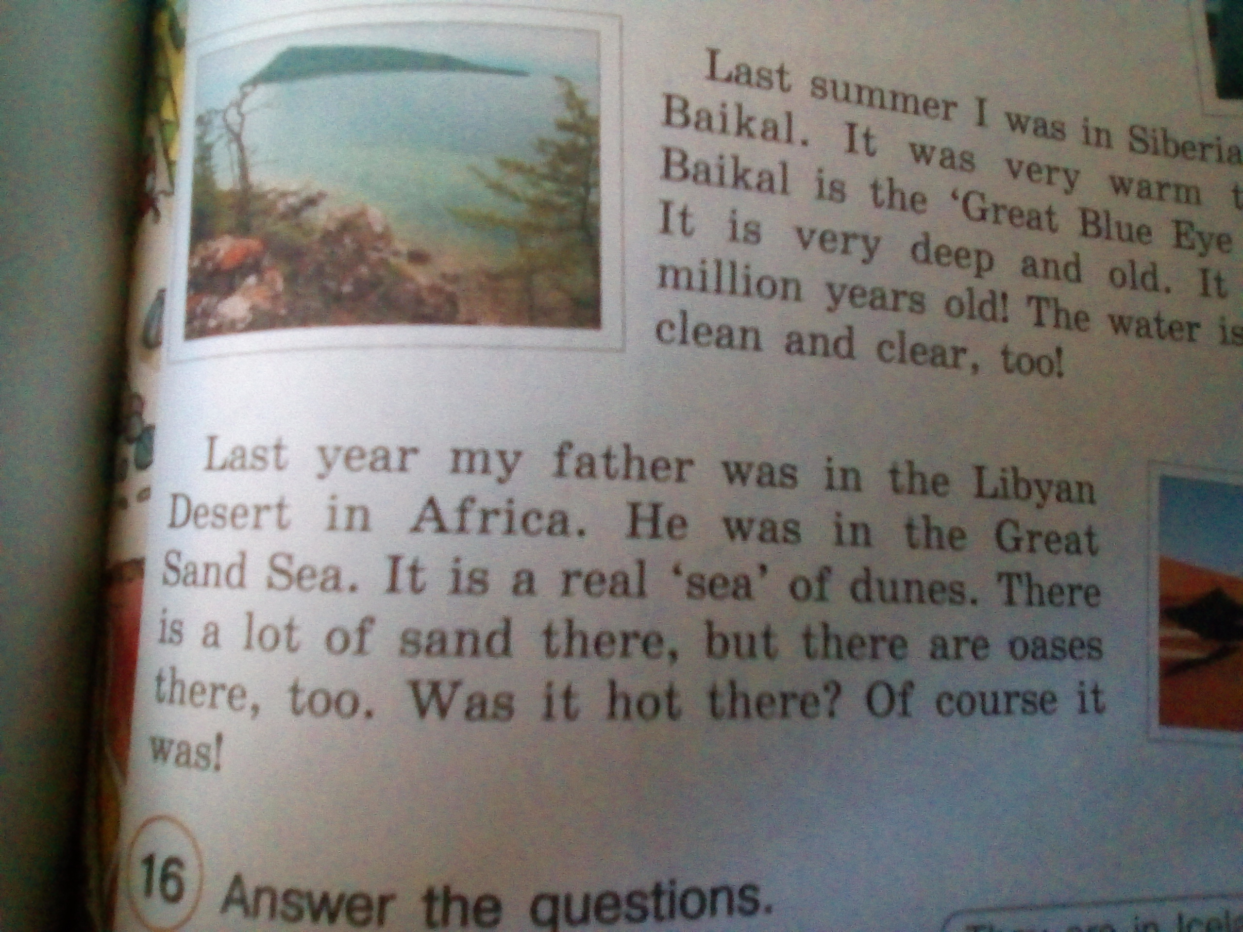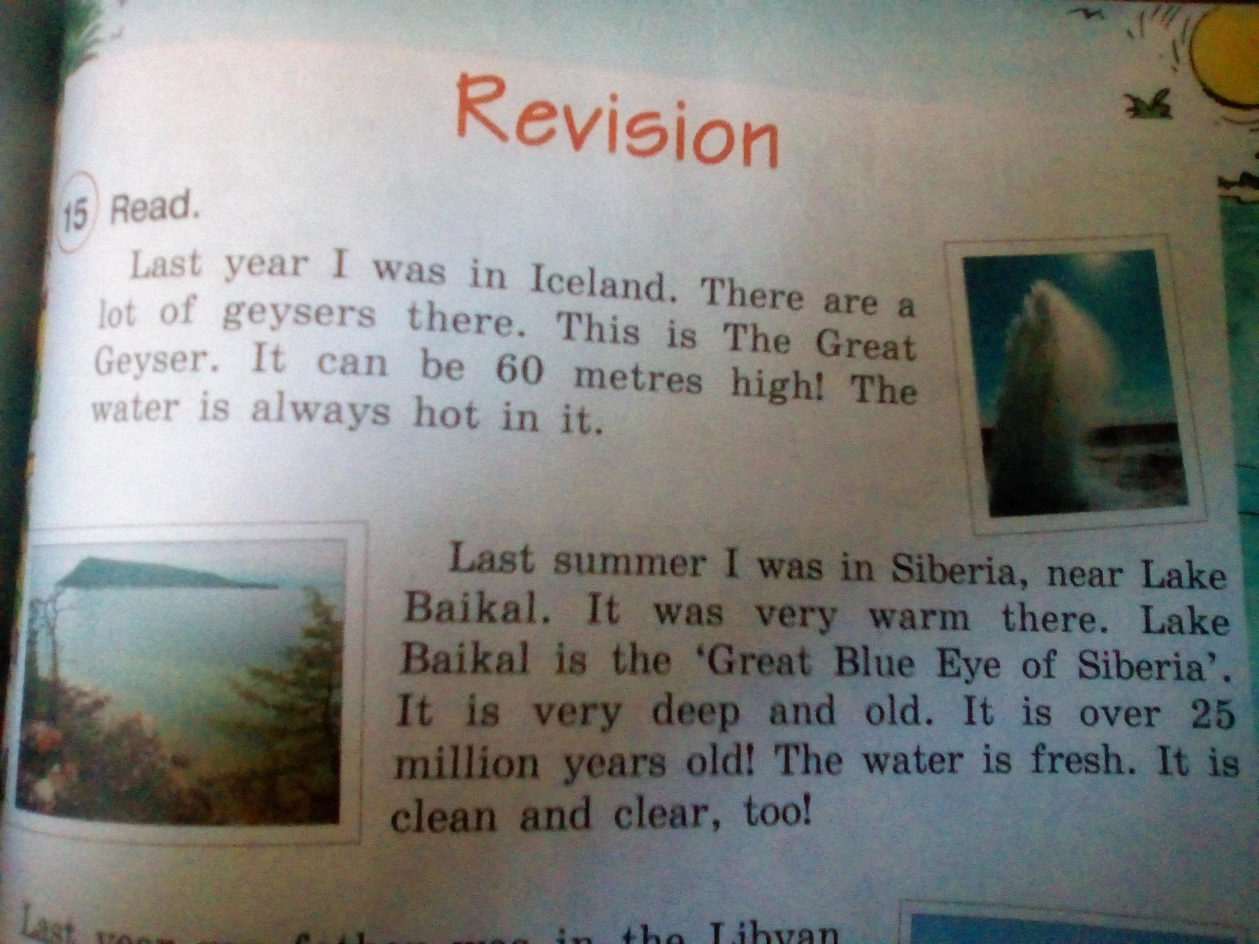 2. Прошлым летом я была в Сибири, рядом с озером Байкал. Там было очень тепло. Озеро Байкал это « Чудесный голубой глаз Сибири». Оно очень глубокое и старое. Более 25 миллионов лет! Вода свежая. Она тоже чистая.