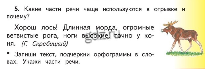 Существительные: кто? - лось, что? - морда, что? - рога, у кого? - у коня.