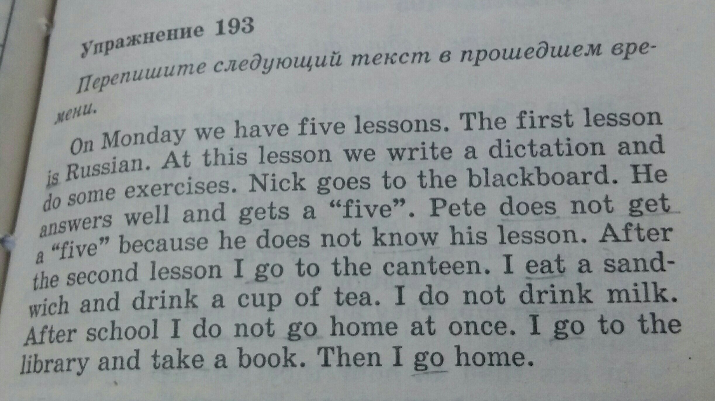 On Monday we had five lessons. The first lesson was Russian. At that lesson we wrote a dictation and did some exercises. Nick went to the blackboard. He answered well and got a "five". Pete didn't get a "five" because he didn't know his lesson. After the second lesson I went to the canteen. I ate a sandwich and drank a cup of tea. I didn't drink milk. After school I didn't go home at once. I went to the library and took a book. Then I went home.