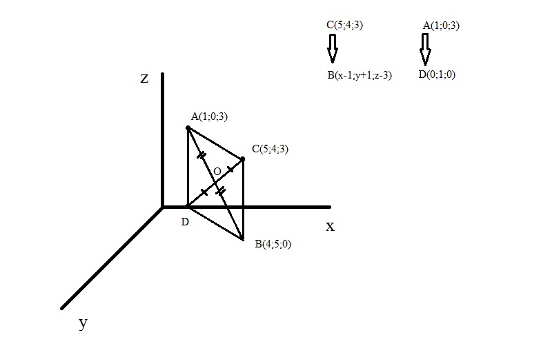 По известным координатам трех вершин параллелограмма найти координаты четвертой вершины и точки пересечения диагоналей,если А(1;0;3),В(4;5;0),С(5;4;3).