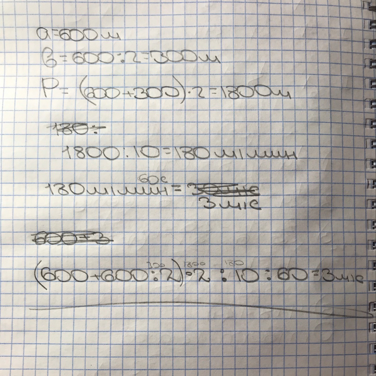 Помогите пж. Длина прямоугольного сада 600м,а ширина -в 2 раза меньше. Мальчик обежал сад по периметру за 10 мин. Сколько метров в секунду пробегал в среднем этот мальчик? РЕШИ ЗАДАЧУ ВЫРАЖЕНТЕМ!!!!!!!!!!